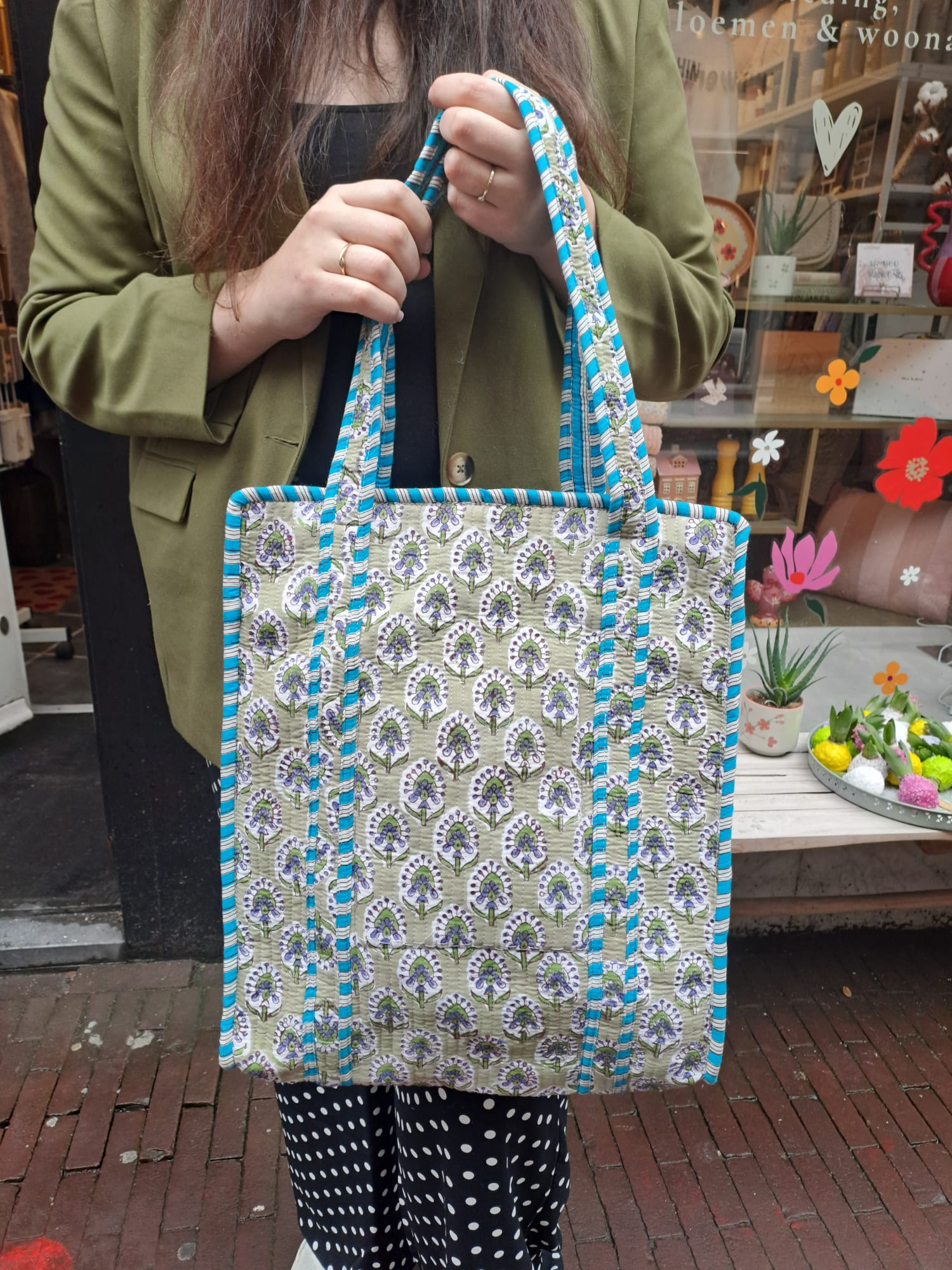 Deze stijlvolle tote bag met authentieke Indiaanse blockprint is eerlijk geproduceerd en met de hand gemaakt. Dankzij het ambachtelijke drukproces is iedere tas uniek en heeft deze een eigen karakter.