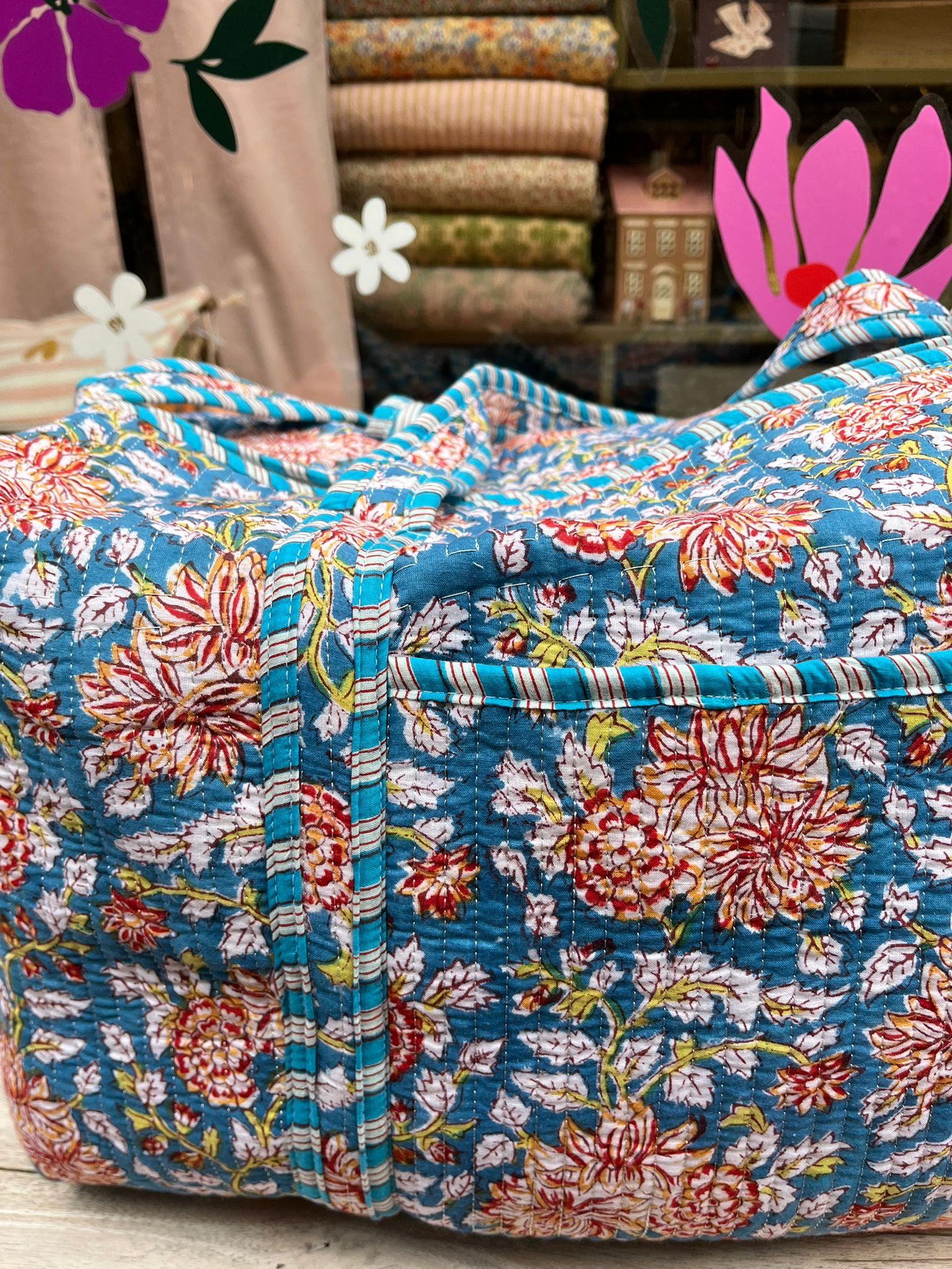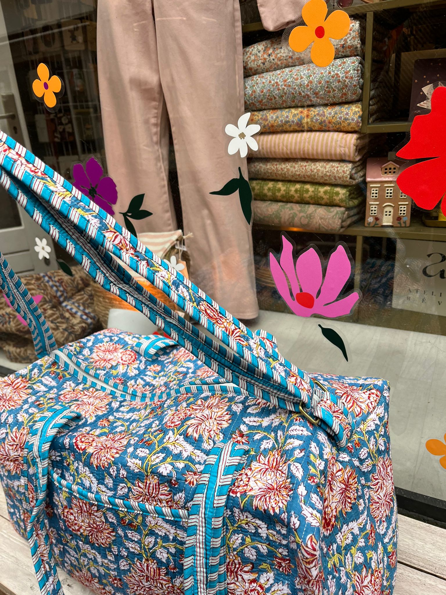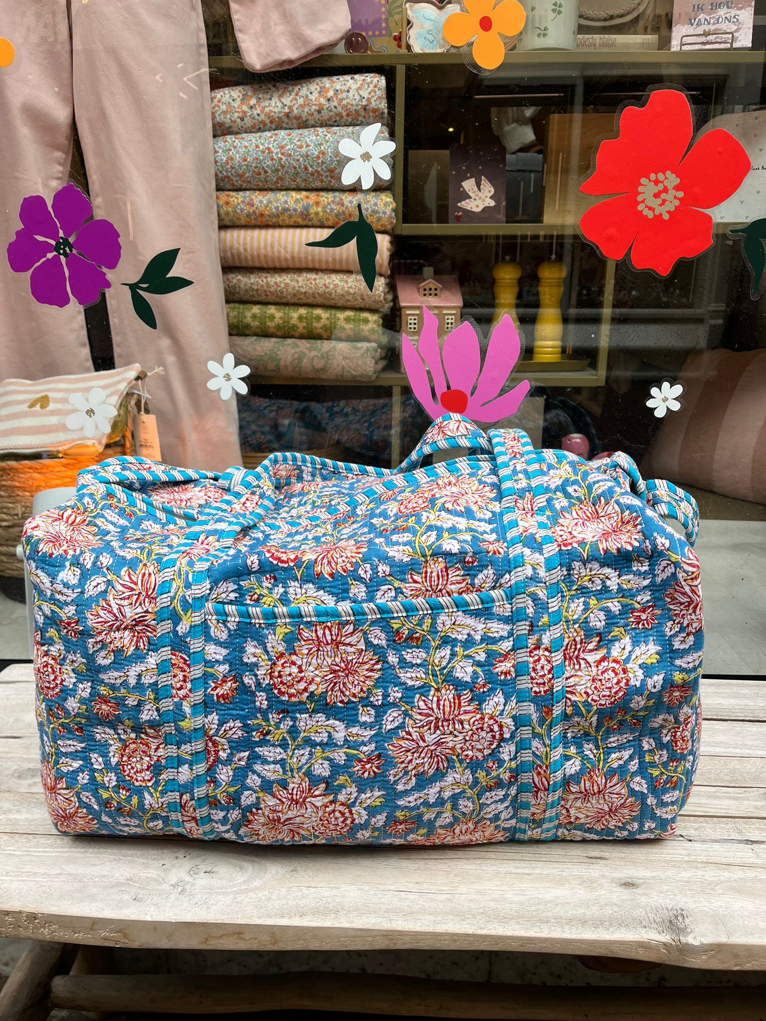 Deze prachtige weekendtas met Indiaanse blockprint is een echte blikvanger. De warme, ambachtelijke print geeft de tas een unieke en vrolijke uitstraling – hier word je gewoon blij van!