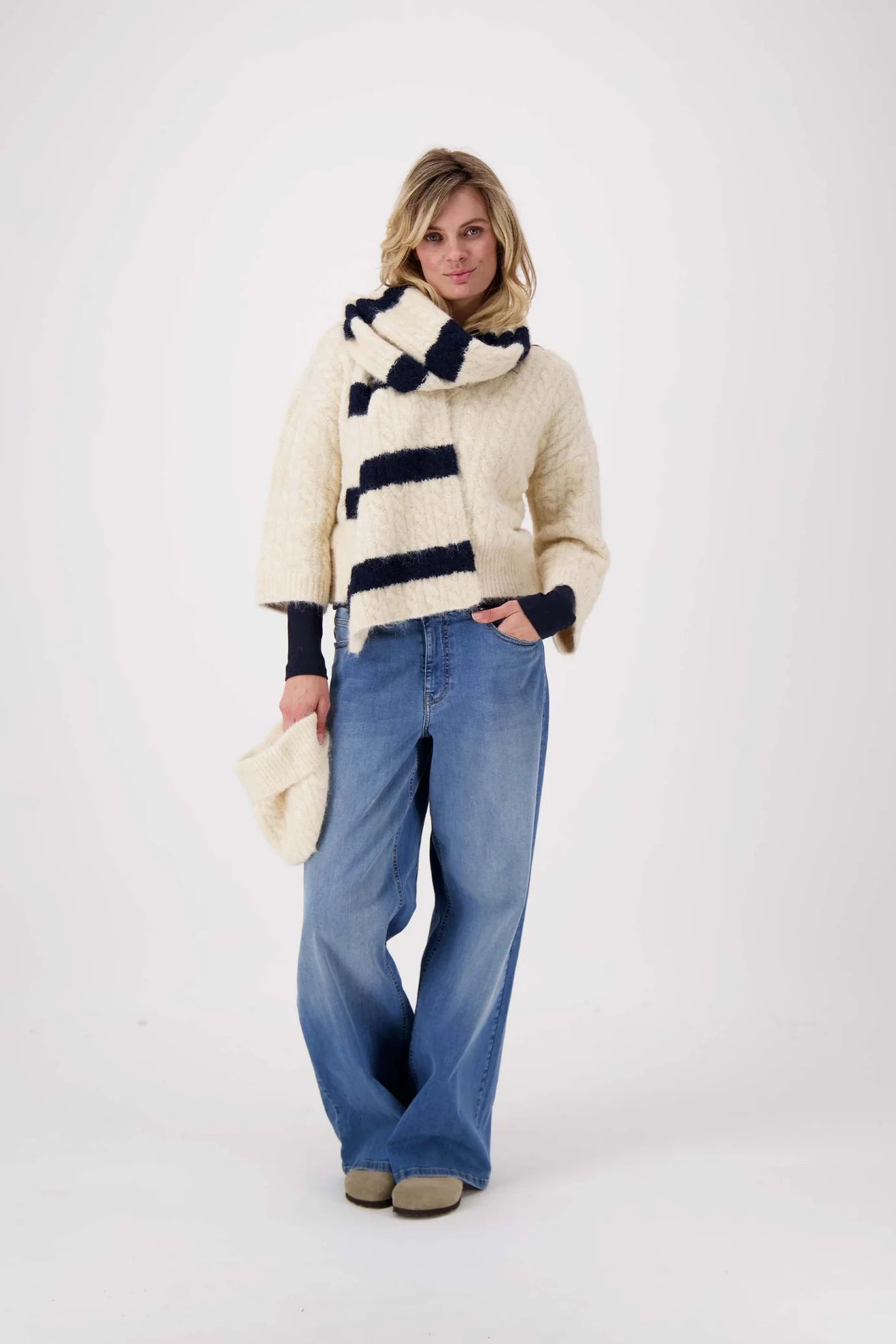 De Zusss gebreide sjaal met kabels is een tijdloze musthave in je accessoires. Deze sjaal met kabelpatroon straalt warmte en gezelligheid uit, ideaal voor frisse dagen. De navy en kit strepen geven een subtiel speels effect, perfect om je winteroutfit een natuurlijke twist te geven. Deze basic sjaal binnen de categorie Sjaals & Mutsen combineert comfort met stijl en maakt het makkelijk om jouw look compleet te maken.