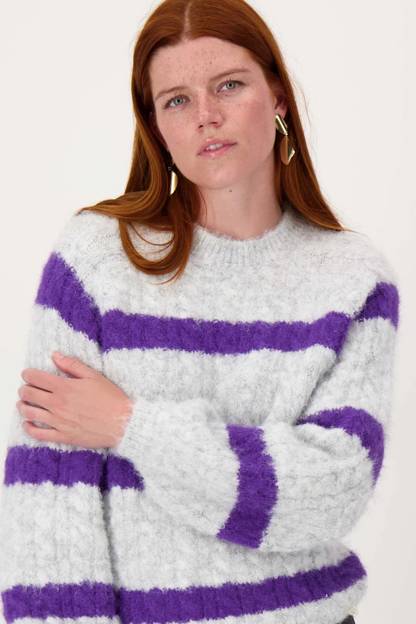 Zusss streep kabeltrui met ballonmouw mid grey mid purple